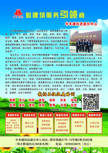 蘭州中豐建科工程技術(shù)中心是一家多元化、綜合型企業(yè),逐步組建完善了勘察、設(shè)計、環(huán)評、建筑、裝飾、勞務(wù)、投標(biāo)、監(jiān)理、造價、建材、商貿(mào)、教育、咨詢、投資等。在蘭州五區(qū)分別都設(shè)有辦事處,在甘肅新疆、青海、寧夏等設(shè)有多家分公司,目前已是西北地區(qū)最具規(guī)模的建筑工程技術(shù)咨詢機(jī)構(gòu)。在加快企業(yè)發(fā)展的新形勢下,中豐建科工程技術(shù)中心武威分中心在5月9日正式成立了,在此,中豐建科總公司對武威分中心的立表示熱烈的祝賀!武威分中心的成立是集團(tuán)服務(wù)西北的一大跨步, 我們堅信在總公司的領(lǐng)導(dǎo)下武威分中心能夠永攀新高、腳踏實地的服務(wù)于社會,使公司步入一個健康、穩(wěn)定、協(xié)調(diào)發(fā)展的新天地,能夠與總公司相互支持,通力合作,竭誠創(chuàng)業(yè)拓新路,增強(qiáng)實力譜新篇,為集團(tuán)公司實現(xiàn)宏偉目標(biāo)作出積極貢獻(xiàn)。