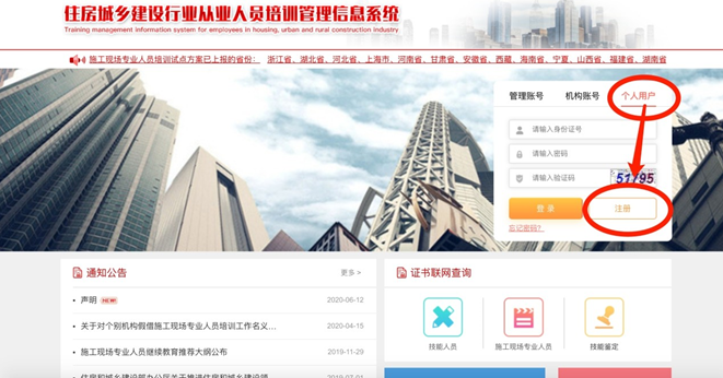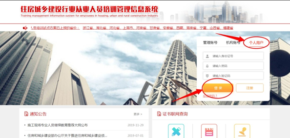 使用電腦打開瀏覽器登錄住房和城鄉(xiāng)建設(shè)行業(yè)從業(yè)人員培訓(xùn)管理信息系統(tǒng)(網(wǎng)址 http://rcgz.mohurd.gov.cn) 進(jìn)行免費注冊,須使用市面主流瀏覽器,如谷歌或 360 瀏覽器并調(diào)至極速模式。學(xué)員請選擇個人用戶登錄端口,如圖所示: