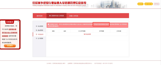 選擇【繼續(xù)教育】標(biāo)簽,點擊住房城鄉(xiāng)建設(shè)行業(yè)從業(yè)人員教育培訓(xùn)資源庫網(wǎng)址進(jìn)入繼續(xù)教育培訓(xùn)網(wǎng)(也可在通過瀏覽器直接輸入http://zyk.etledu.com 打開網(wǎng)站),如圖所示: