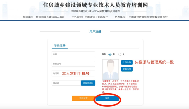 根據(jù)系統(tǒng)提示輸入本人信息,包括姓名、身份證號、常用手機號、獲取驗證碼完成注冊。注冊成功后,系統(tǒng)提示: “注冊成功,用戶名為身份證號,初始密碼為手機號”,建議更換高強度密碼,以防個人信息泄露。(頭像須與管理系統(tǒng)頭像相同)