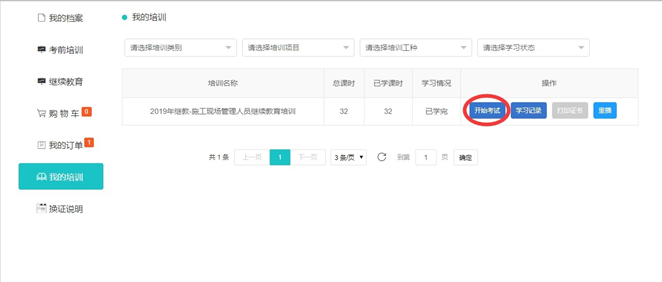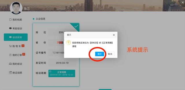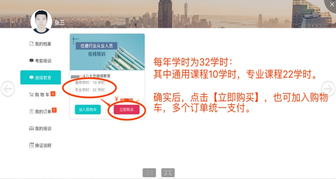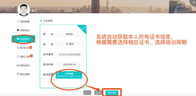 首次注冊成功后,系統(tǒng)自動跳轉(zhuǎn)到個人用戶頁面,將從部管理系統(tǒng)中下載本人已有證書信息,選擇需要進(jìn)行繼續(xù)教育學(xué)習(xí)的證書后,進(jìn)行提交,系統(tǒng)自動生成課程訂單。