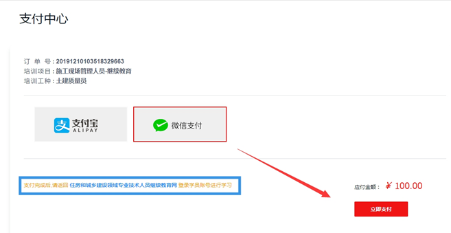 訂單生成后,點擊【立即購買】,頁面將跳轉(zhuǎn)到在線支 付頁面,可選擇【微信】或【支付寶】進(jìn)行支付,在新頁面 掃描支付二維碼完成支付,支付成功后,系統(tǒng)提示將自動返回培訓(xùn)網(wǎng)界面。(推薦使用微信支付)