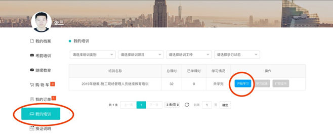提示:若本人有多個證書,根據(jù)個人需要可選擇報名多 個崗位證書的繼續(xù)教育,首先學(xué)習(xí)先報名的崗位,當(dāng)年年度自第二個崗位開始,通用課程免學(xué)。培訓(xùn)周期僅顯示當(dāng)前時間近 2 年內(nèi)的周期,周期時間為一個自然年度(例:2019 年1 月 1 日至 2019 年 12 月 31 日)。請先選擇本年度周期進(jìn)行學(xué)習(xí),如主管部門有要求的再選擇上一年度周期。