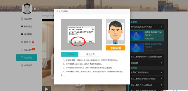 點擊【開始學(xué)習(xí)】后,彈出攝像頭麥克風(fēng)的使用提示,點擊“允許”啟用攝像頭,否則會因為不能識別無法進(jìn)入系統(tǒng)。 學(xué)習(xí)時電腦須配備攝像頭,學(xué)習(xí)過程中抓拍照片。