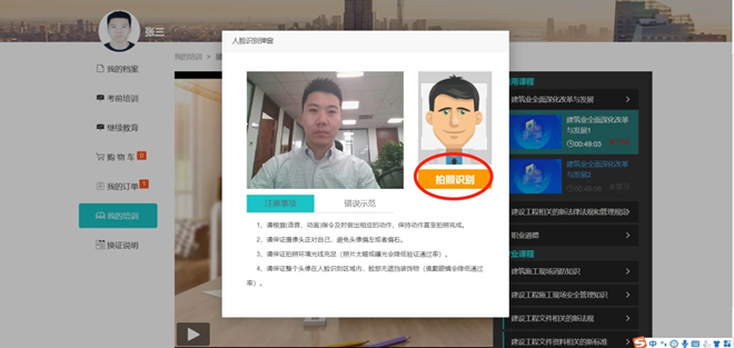 彈出攝像頭人臉識別框后學(xué)員本人將面部對準(zhǔn)攝像頭, 點擊“拍照識別”,系統(tǒng)將進(jìn)行動態(tài)面部識別,識別成功后自動跳轉(zhuǎn)學(xué)習(xí)界面進(jìn)行學(xué)習(xí),請務(wù)必保證本人信息真實,經(jīng)核查系統(tǒng)抓拍照片,如發(fā)現(xiàn)替學(xué)情況,系統(tǒng)將進(jìn)行學(xué)時清零, 需重新學(xué)習(xí)。
