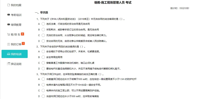 全部學(xué)時學(xué)習(xí)完成后,可進(jìn)入在線考核環(huán)節(jié),題目共 50 道,滿分 100 分,60 分(含)以上為合格?己宋赐ㄟ^的, 可繼續(xù)考核測試,直至合格為止,考核未通過不影響學(xué)時累計。