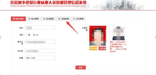 注冊成功進(jìn)入系統(tǒng)后,請完善個人信息,上傳本人照片( 必須為本人近期一寸白底免冠照片, 文件大小不超過80KB),請確保本人照片無誤,一經(jīng)上傳不可修改。在【證 書管理中】可查詢已經(jīng)由建設(shè)行業(yè)行政主管部門上傳的有效證書,完成繼續(xù)教育后即可換發(fā)電子培訓(xùn)合格證。