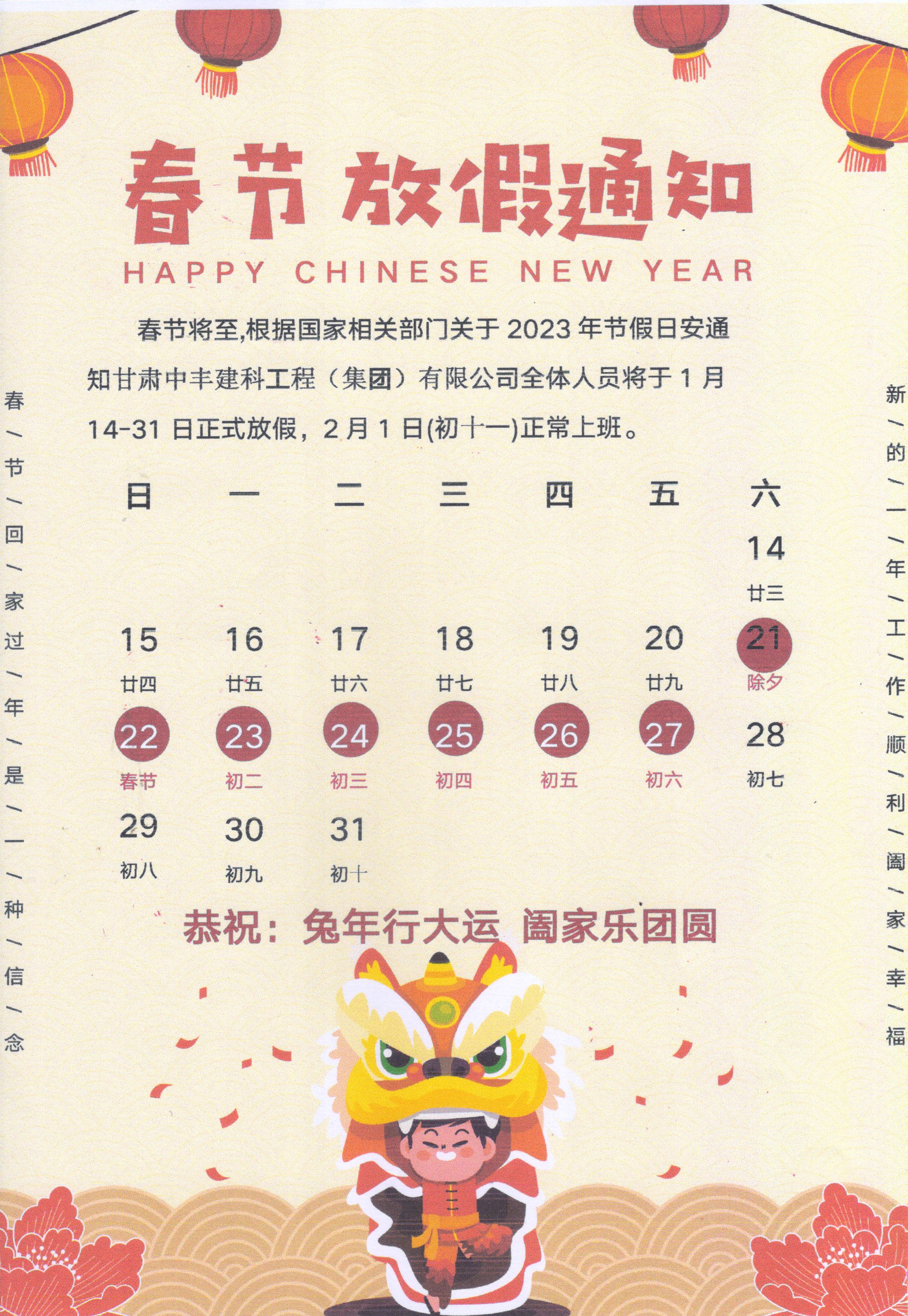 首先感謝大家在2022年給予我公司的鼎力支持。在2023年春節(jié)即將來臨之際,我公司全體員工恭祝大家新春愉快,闔家歡樂,萬事如意,兔年吉祥!