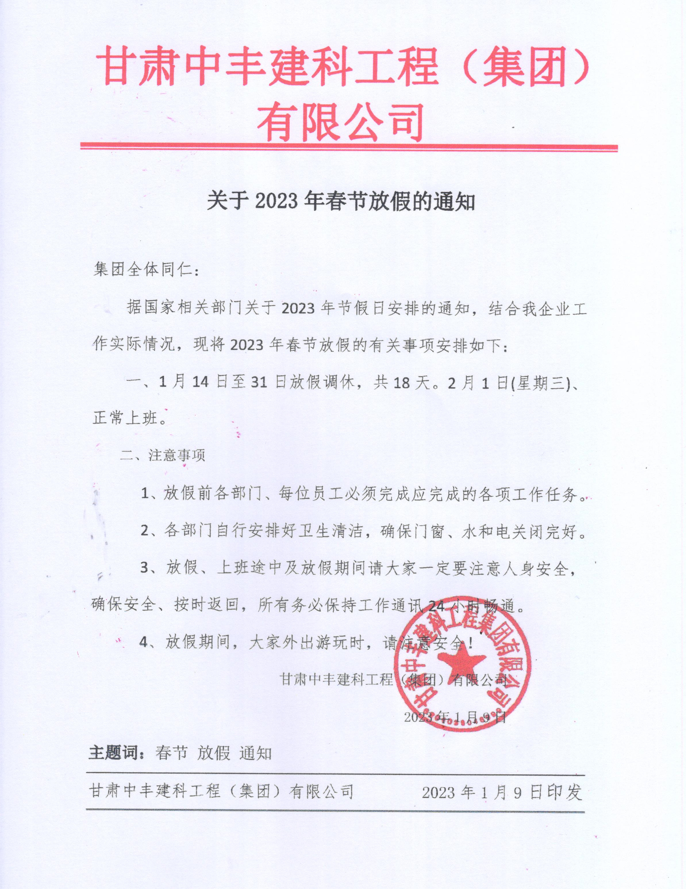 按照公司《員工手冊》規(guī)定,春節(jié)公司放假時間定為2023年1月14日(農(nóng)歷臘月二十三)至2023年1月31日(農(nóng)歷正月初十),共十八天,2023年2月1日(農(nóng)歷正月初十一)正式報到上班。