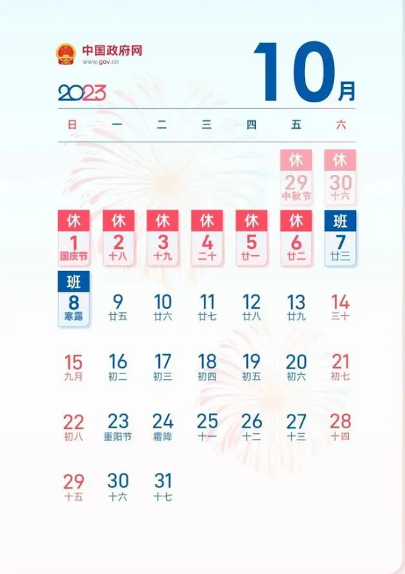 2023年9月29日(星期五)至10月6日(星期五)放假調(diào)休,共8天。10月7日(星期六)、10月8日(星期日)上班。提前預祝各位中秋、國慶雙節(jié)快樂!闔家團圓!